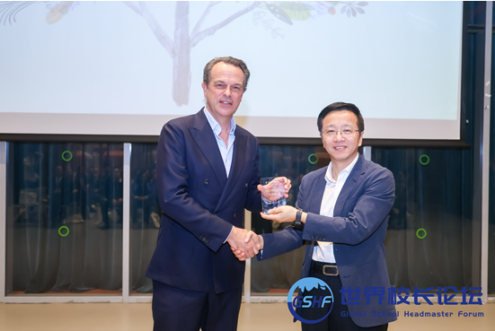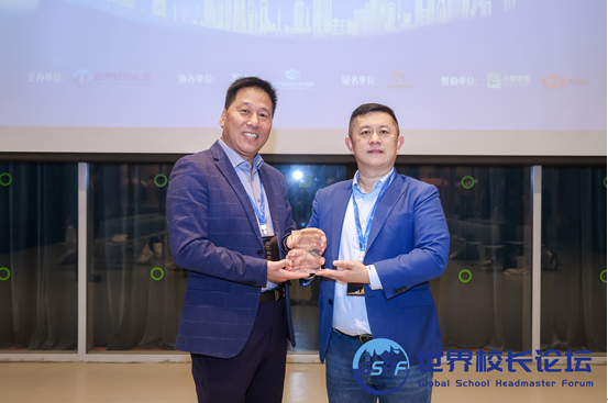 世界校长论坛秘书长徐志文为深圳哈罗国际学校中方校长钱浪颁发湾区优秀校长奖杯